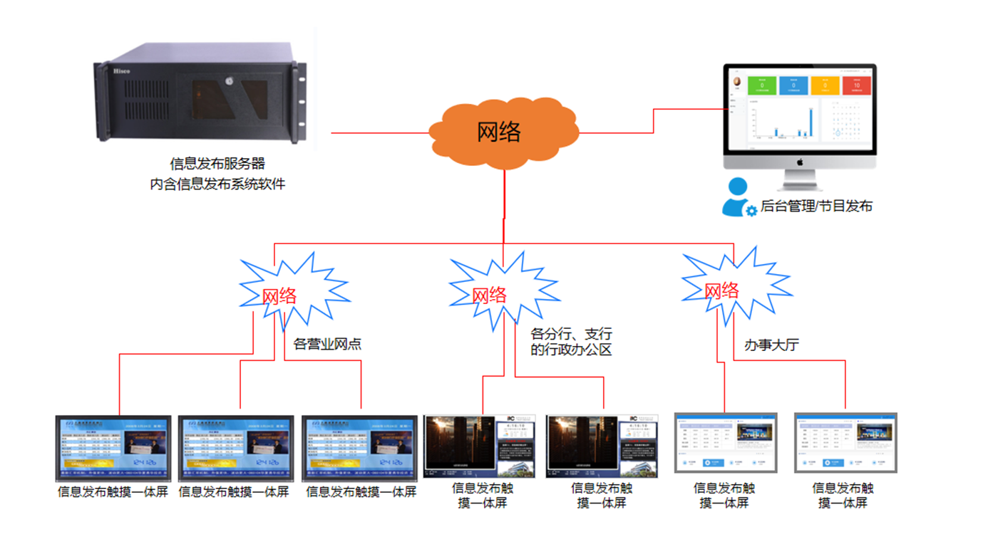 1)将金融自身的形象介绍、金融产品知识、基金汇率、业务通知通告等,发布给营业厅内的所有受众。