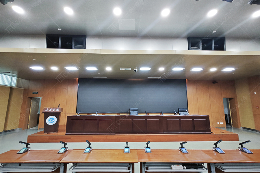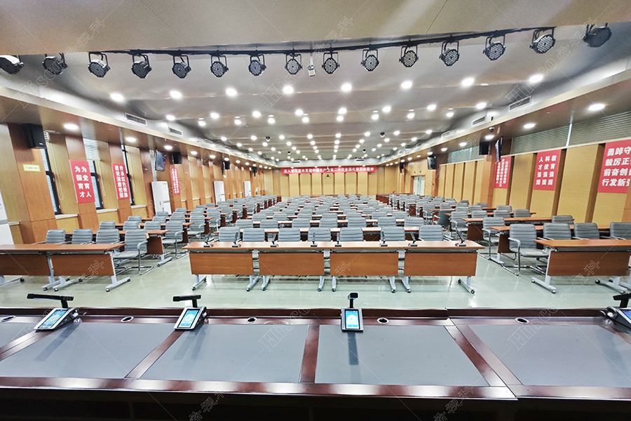本校报告厅是一个中大型报告厅,主要为举办学校学术会议、演讲、公共大课培训及各种文艺演出,根据其建筑结构特点和使用功能及国家相关标准,根据面积和观看距离选择合适的LED大屏,展现整个舞台的宏伟大气;扩声采用集中与扩散相结合的扩声方式,开会和报告时采用单声道集中扩声还原模式,所有音源都从主席台发出,声像的平衡、方位无倾斜,保证了下面学生听到的直达声响度和均匀度达到要求,让学生听的适宜和舒服。演出时采用左右立体声空间成像模式,直达声与辅助音箱的效果声相结合表演,传达表演意境,使得演员和观众之间产生一种无声的交流。